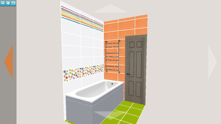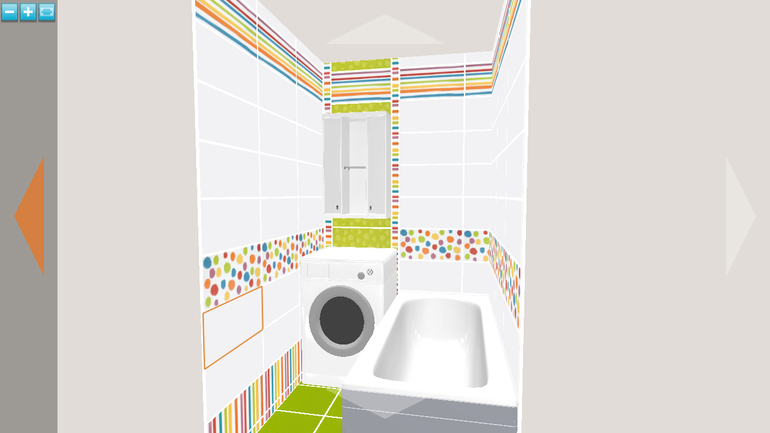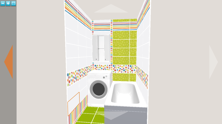 Извините, но совсем не нравится. Называется - я надену все лучшее сразу. Посмотрите на стену, где стиралка. Там и белая плитка, и зеленая, и полоски, и кружочки, и бордюр вертикальный - очень всего много для такого маленького помещения. Пробуйте еще. Может декор разместить не горизонтально, а вертикально, выделяя зоны.