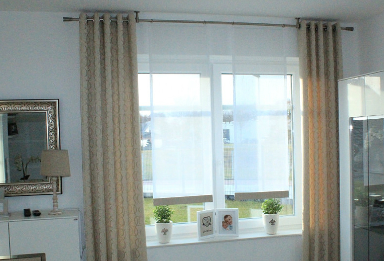 у нас делают еще боковые шторы на кольцах с плотной ткани а середина панельки.