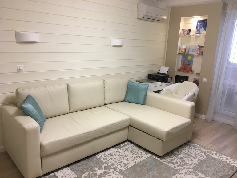 Размер около 16м., сама очень люблю угловой диван из-за возможности не разбирая прилечь))) буду скучать, конечно, придется вести активный образ жизни, а не валяться на диване)