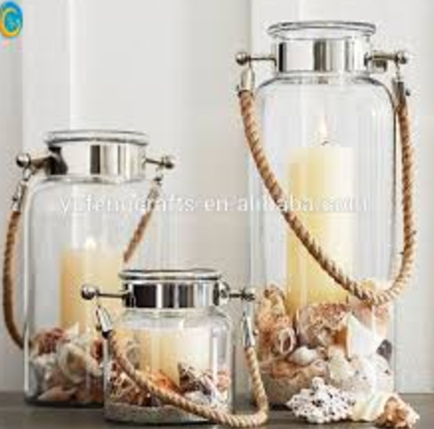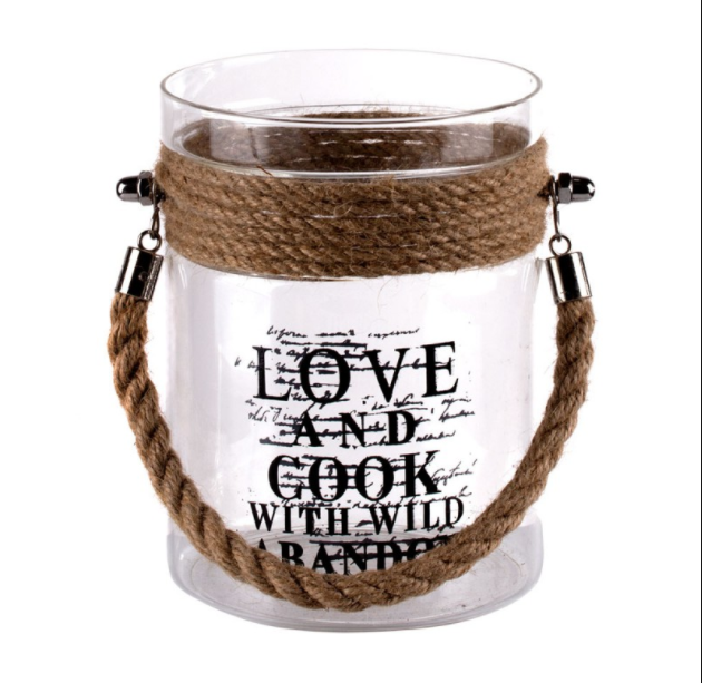 Из толстого стекла, обьемная, высотой см.20, на передней части надпись синими буквами на английском. Самое главное-есть ручка, она из белых нитей, плетение канат. Соединена с вазой металической пряжкой. Неделю мучаюсь,найти не могу. Мысли только о ней. Помогите!!
