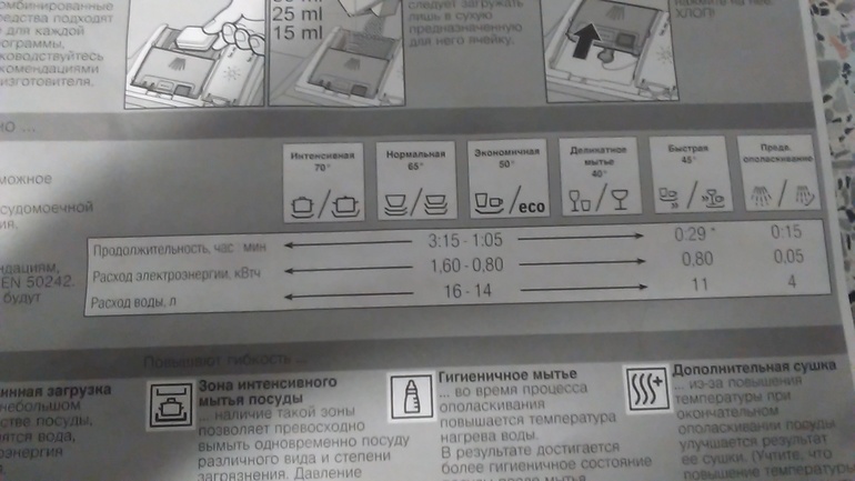 У нашей их три - 65 градусов, ЭКО 50 градусов, 45 градусов. Есть ещё быстрая и функция 1/2. Дисплея нет, нигде не высвечивается. Такой листочек с краткой инструкцией тоже есть, но и там время не указано((