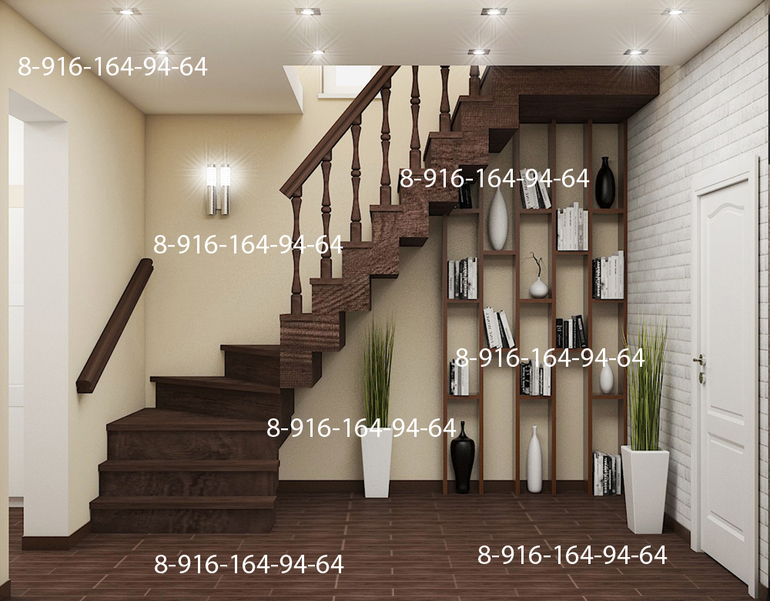 Под лестницей спроектирован стиллаж, в который можно поставить сувениры, вазы, книги, рамки с фотографиями ....