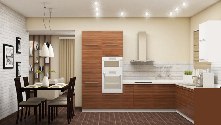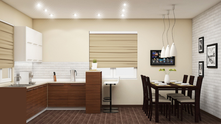 Большая Кухня в форме буквы "П" заканчивается барной стойкой.