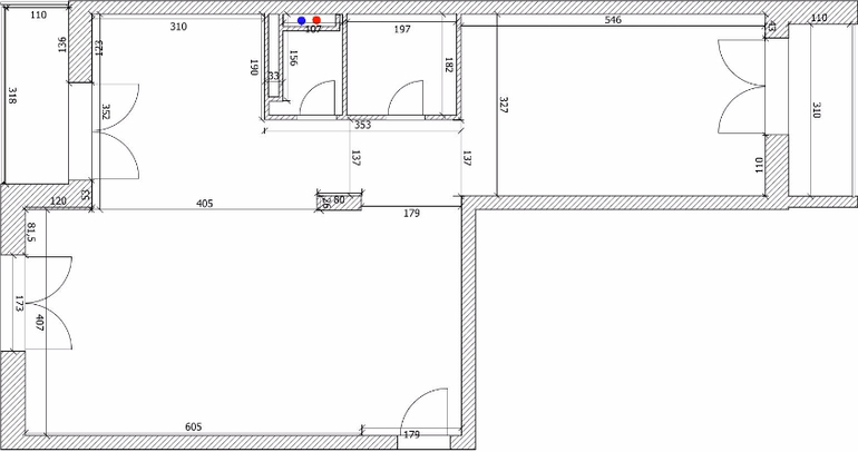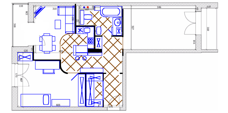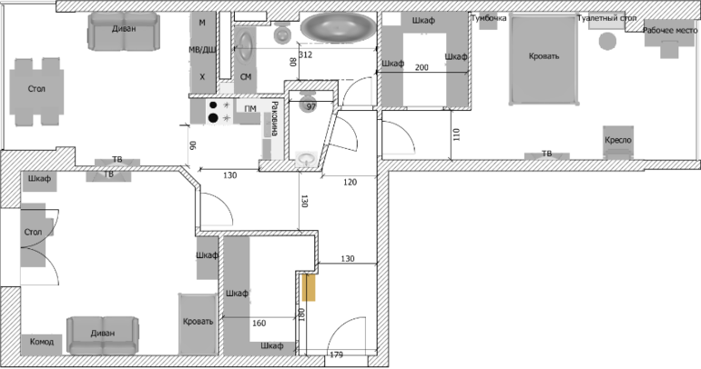 В кухне-гостиной необходимо разместить кухонный гарнитур, стол, диван, ТВ. После обдумывания и прорисовки многочисленных вариантов начертила такое планировочное решение. Нравится, что рабочая поверхность кухни в стороне и для гостиной-столовой остается достаточно места. Нравится, что зона прихожей с гардеробной не будет проходной. Немного смущает организация входа в ванную и туалет. Может быть можно как-то более удачно спланировать эти помещения? Или есть идеи как лучше организовать кухню-гостиную? Посоветуйте, пожалуйста, буду очень благодарна!!!