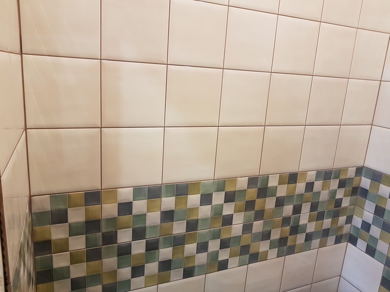 Может напротив плитки акцентную стенку сделать из однотонных серых, а остальные однотонные оливковые?)
