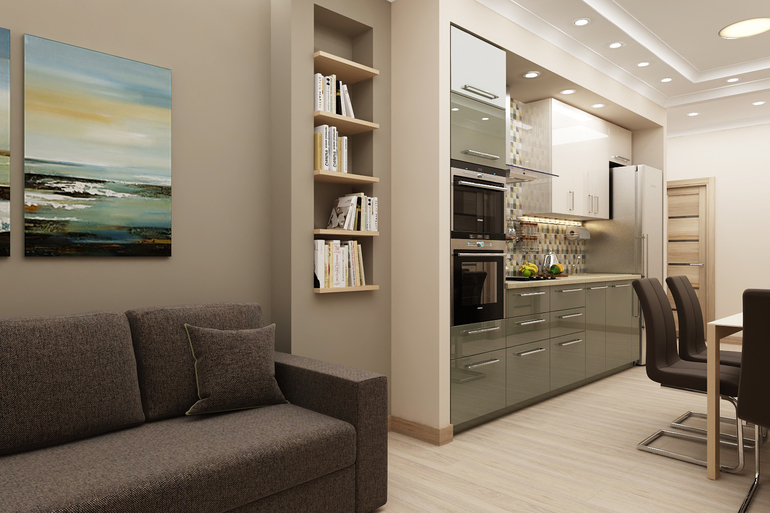Только однотон. Причем если кухня оливка - стены серые и т.д. А на стену напротив одну или несколько картин или фото в этой же гамме.