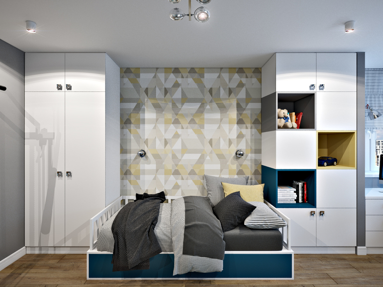 очень активные, хотя красивые! я бы в зону телека желтые поклеила, в спальной зоне однотон, а синие вместо грифельной стены. от мела пыль летит...