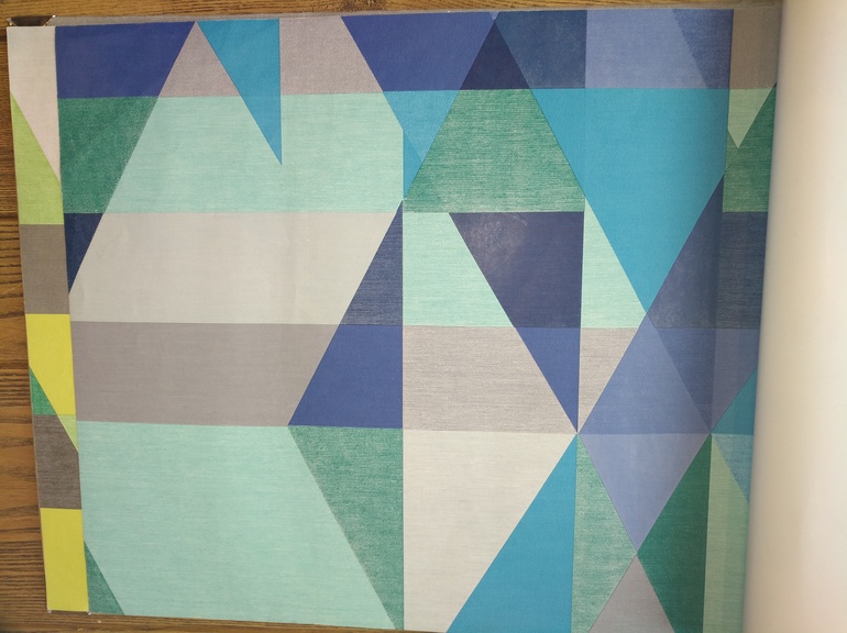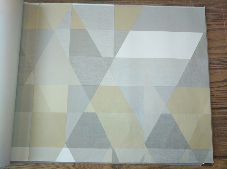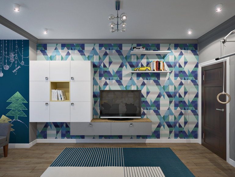 Я бы стену с телевизором поклеила однотонными обоями. Мелькающие картинки и пестрая стена слишком тяжело будут восприниматься. У нас на кухне несколько похожие обои с треугольниками, но пастельных бежево-голубых цветов. Телевизор на них был бы лишним.