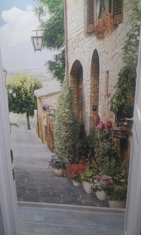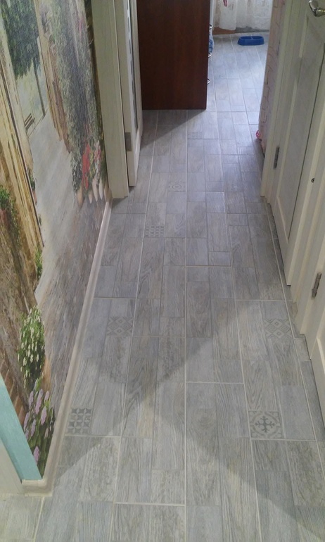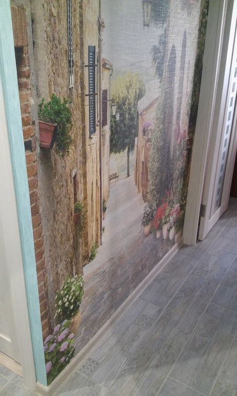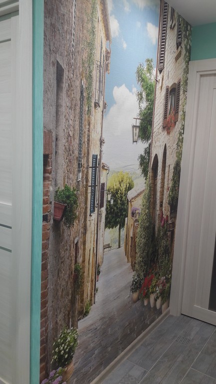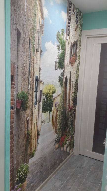 На сайте фотообоев (точнее в их группе в ВК) нам предложили эту картинку, не видя нашего пола и совершенно случайно совпало, что тротуарная плитка на фото совпала с нашей плиткой. Здесь лучше всего это видно.