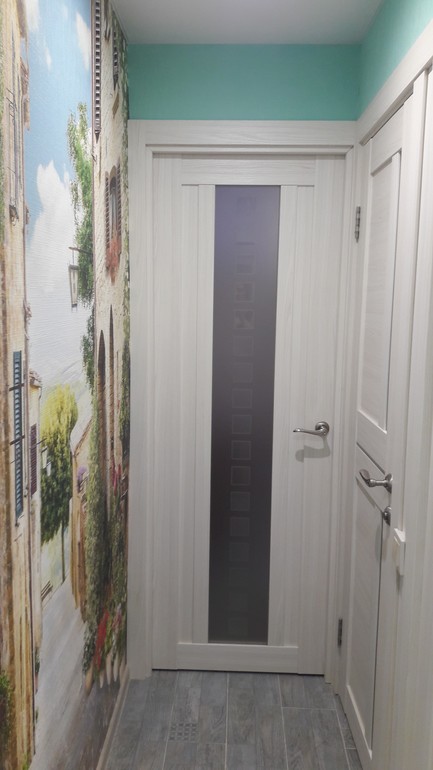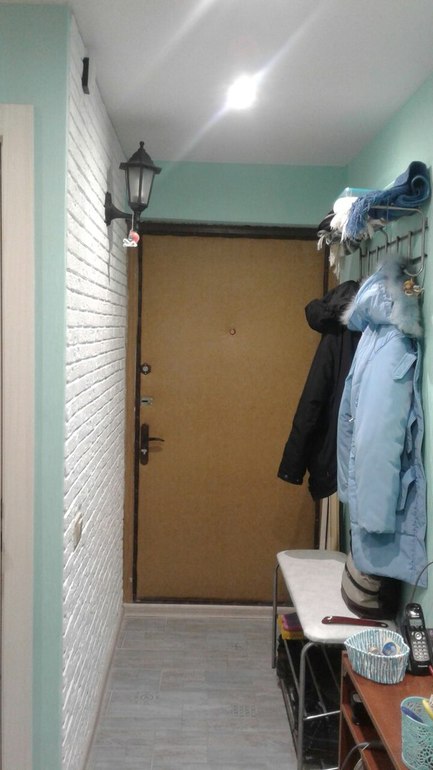 Входная дверь пока останется прежней. Была идея купить другую обивку, светлую, но побоялись делать сами. А сейчас уже привыкли. Но в перспективе уже выбрана какая будет.