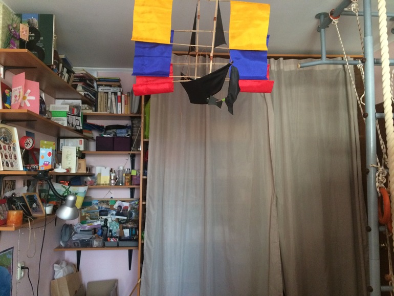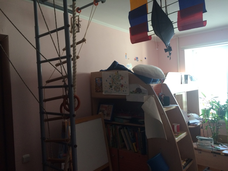 Дверь между спортивным уголком и шкафом. Все рисунки, висящие повсюду, наклейки на стенах, кайты на потолке и тд, разумеется, будут убраны. Если определить куда-то туристическое снаряжение наше (куда вот только?), вещи сына надеюсь уместить в свой шкаф. Чтоб хочется по итогу: пустой пол, один стол, спортивный уголок, цветы