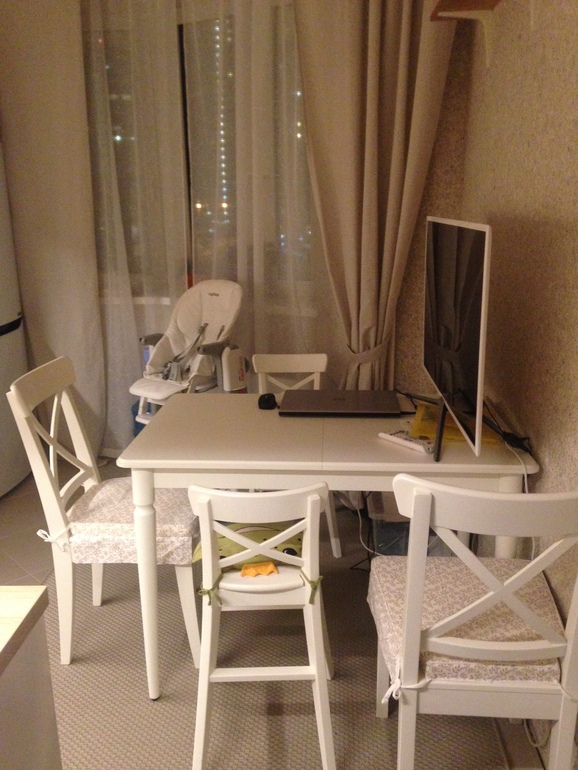 У нас кухня 9,6кв, нас тоже пятеро. Мелкая в татамии, старшая и средний на детских икеевских стульях, мы на двух обычных икеевских. Стол мы брали не в икеа, из-за размера. У нас меньше: Все входим.