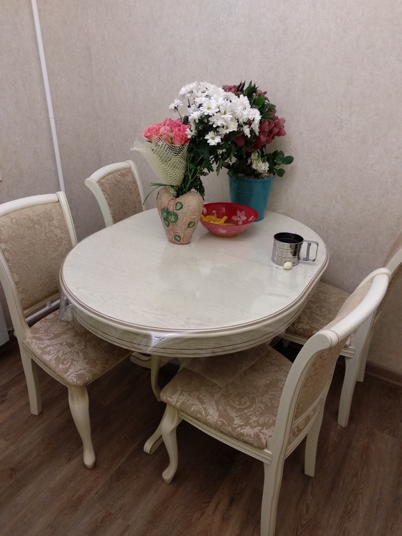 Посмотрела ещё раз Дижон, по мне узковат и мунус что по богам ноги... Но у вас какая кухня по размеру? Вы стулья в промежутке норм передвигали? А так стол красивый, с плиточной. Кстати если боитесь дерева - не бойтесь, я на АлиЭкспресс заказала прозрачную толстую пленку, и все дерево видно и не спрятано! Силиконовая скатерть типо)))