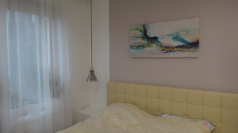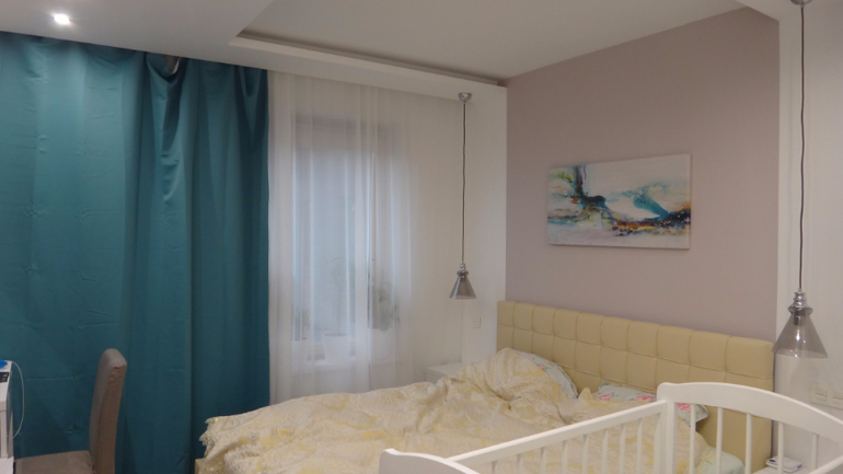 интерьер у вас современный получился ,картина в изголовье классная ,но мелковатая ,картина и объединяет весь интерьер . Шторам двуцветным и на подхватах категорическое нет . Подушка с цветочным принтом тоже нет ,геометрия да . Сшила бы 2 варианта штор летний и зимний ,светлые однотонный в цвет стен визуально комнта казалаась бы больше . И летние бирюзовые ,но не такой агрессивный цвет ,а более пастельный . Варианты подушек