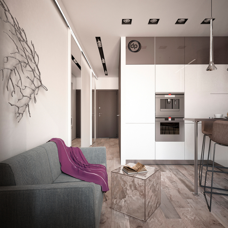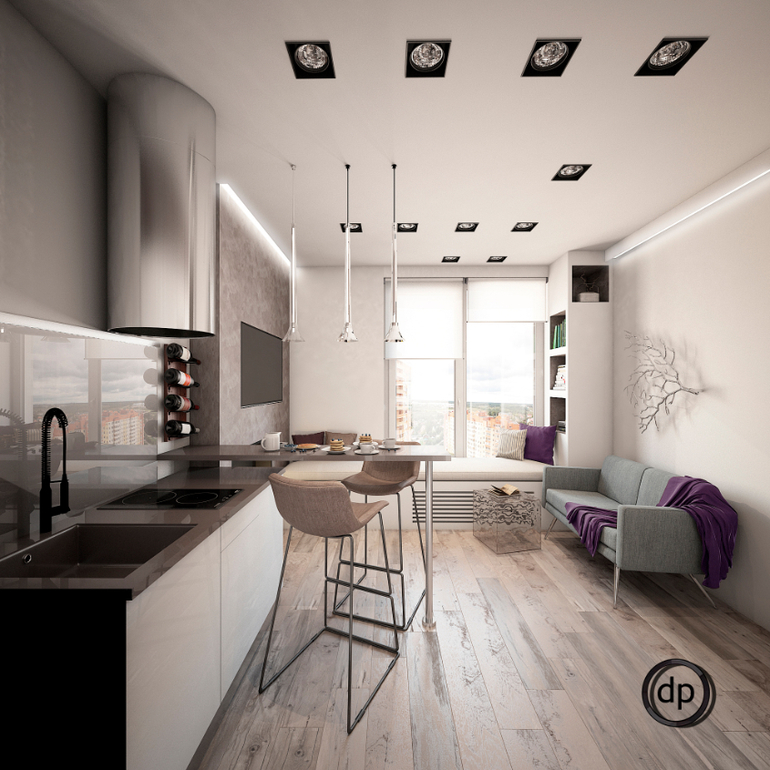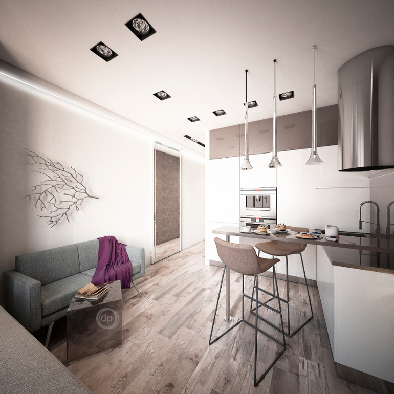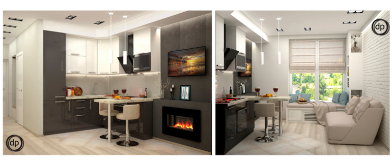 В своем варианте, я добавила интерьеру воздуха, благодаря переносу зоны хранения и выбрав менее массивную мебель: