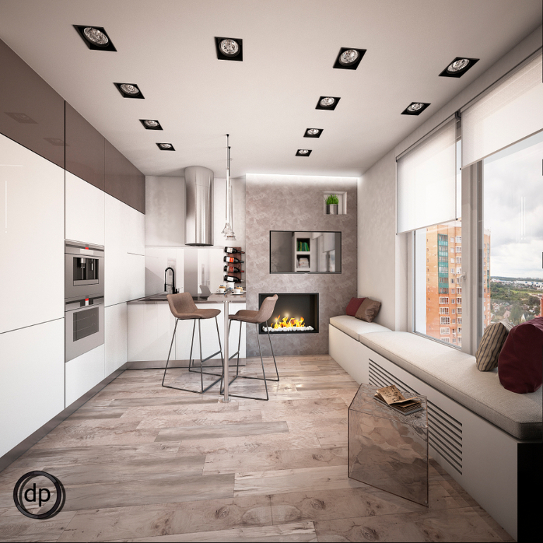 2. Заказчики любят проводить время у камина и у окна за прочтением книг, поэтому на своем варианте я продлила зону подоконника до стены с ТВ, чтобы можно было провести время за прочтениемкниги как у камина, так и у окна.
