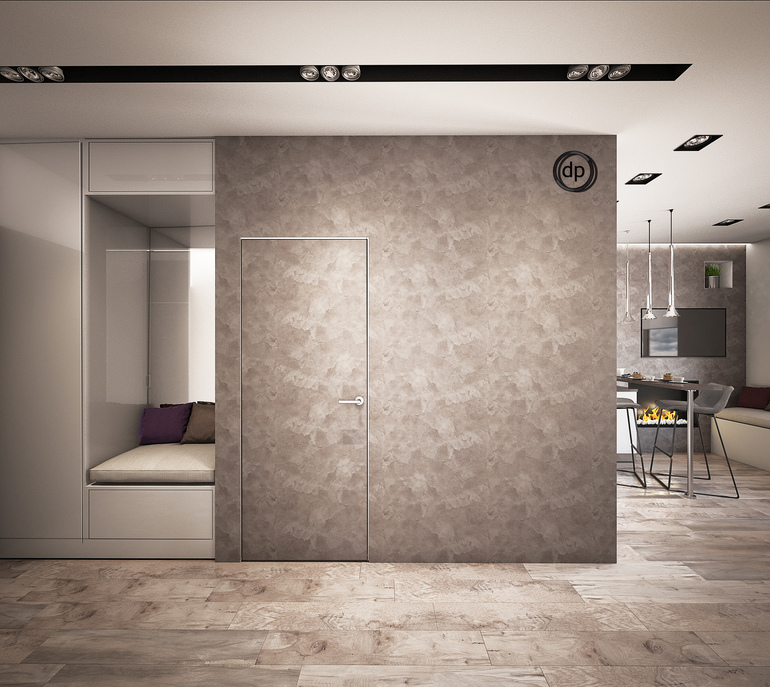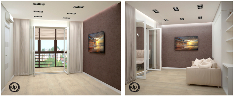 Я люблю на разных ракурсах показывать разные решения, это помогает выбрать и решить на чем лучше остановиться. В комнате я использовала не только разную цветовую гамму мебели, но и показала другое решение входной зоны: вместо раздвижной двери, использовала скрытую под покраску.