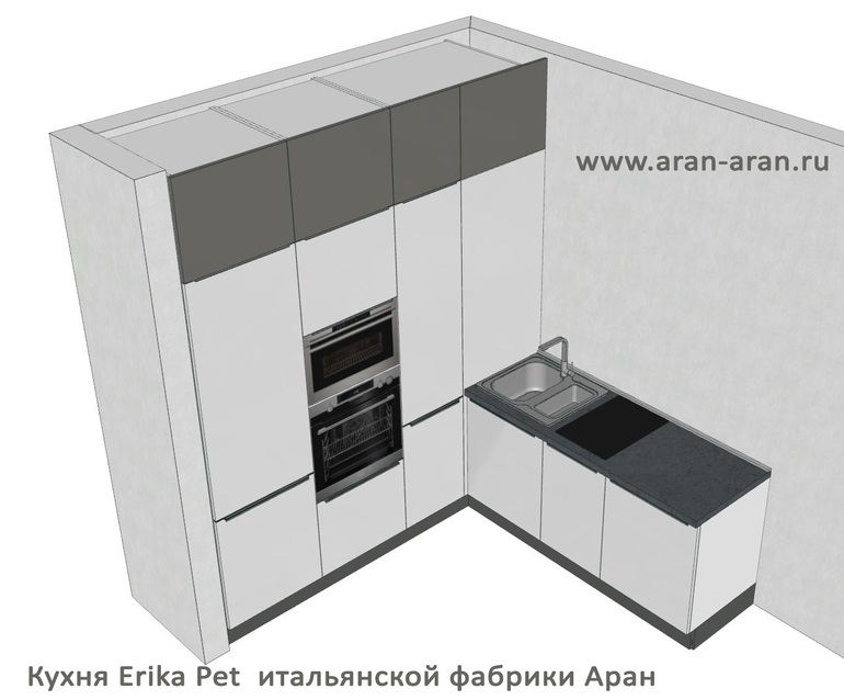 3. Я видоизменила кухонный гарнитур. Когда мы обсуждали проект кухни, выяснилось, что Заказчики редко готовят, поэтому, на своем варианте, я решила использовать немного другой вариант гарнитура, полностью отдав одну стену под хранение техники и посуды, облегчив остальную часть. Варочную панель, при желании, можно заменить на побольше.