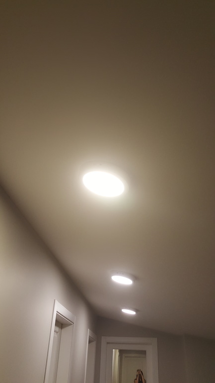 а вот эти над столом. Специально не включила что бы было видно как это выглядит все. Светодиоды запаяны. Ничего не надо менять. Эти над столом по 18 вт. Го у них угол освещения небольшой. 60 градусов. То есть они освещают только поверхность стола. Акцентные светильники. Те что в коридоре- по 12 вт. В коридоре очень светло. Столько и не нужно. Мы их редко включаем. Хватает лестничных светильников. Их два.