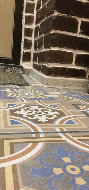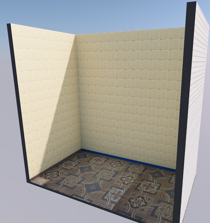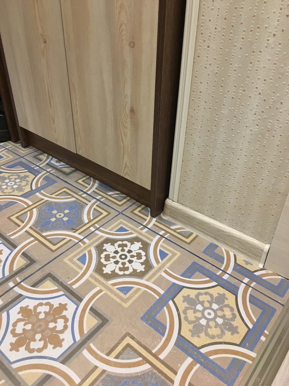 Бледно-желтая плитка неплохо получается, а плинтус можно из синей или коричневой, в тон напольной: