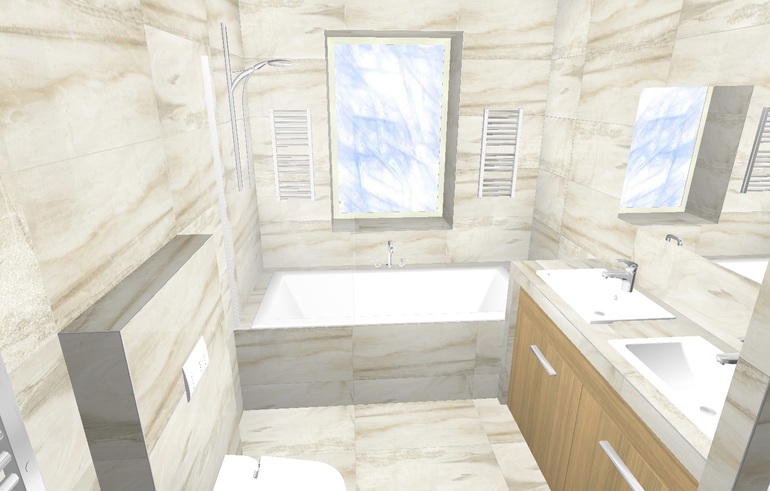 А вы не думали про угловую ванну https://www.vanna-doma.ru/shop/vanna/uglovyie/asimmetrichnye/Alpen_Nevada-6557.html Мне кажется с ней будет просторнее? Ваш проект неплохой, только зачем вам две раковины?