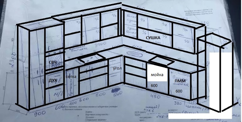 Разбивка на фасады и ящики оставляет желать лучшего. Все фасады разные, не гарнитур, а настоящий хаос. От сушки до посудомойки далековато.