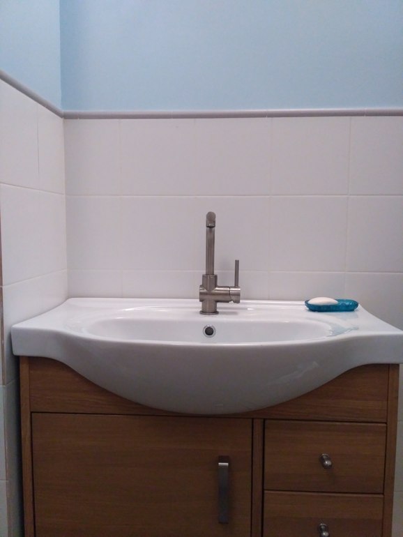 В зоне раковины однозначно надо тоже плитку, прям несколько рядов, до зеркала