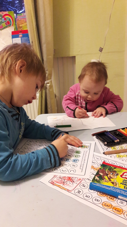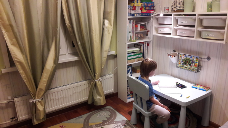 Теперь у сына всегда под рукой разные материалы, игры, альбомы. Контейнерами в полке он тоже пользуется самостоятельно( и регулярно ставит их штрих-кодами наружу))). Там хранятся карандаши, краски, пластилин, кисти, ножницы и рабочий материал.