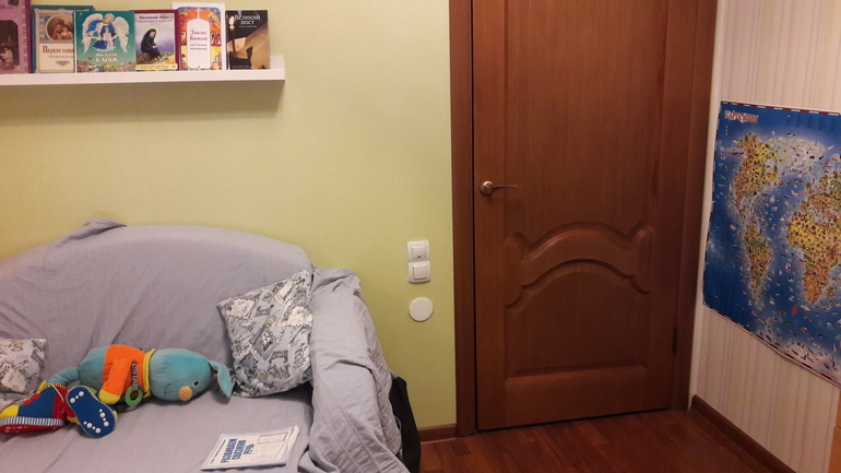 Между мольбертом и входной дверью временно стоит комод(не стала фоткать). Карта просто супер! вписалась и придаёт какое то мальчишество комнате.