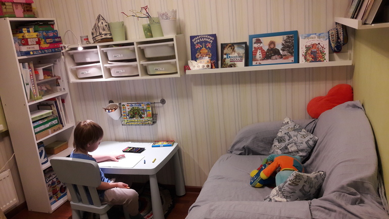 Что ещё изменить в планах.....Не могу отказаться от мысли впихнуть стеллаж Каллакс на 8 ячеек. Но это ближе к школе, что бы к нему приставить столешницу. В угол, где мольберт. И к этому же времени поменять диван на кровать и переселить сына. Хотя муж оооочень против ещё одного стеллажа. Но со временем будет видно....Стену за диваном красиво оформить фото и рисунками сына.
