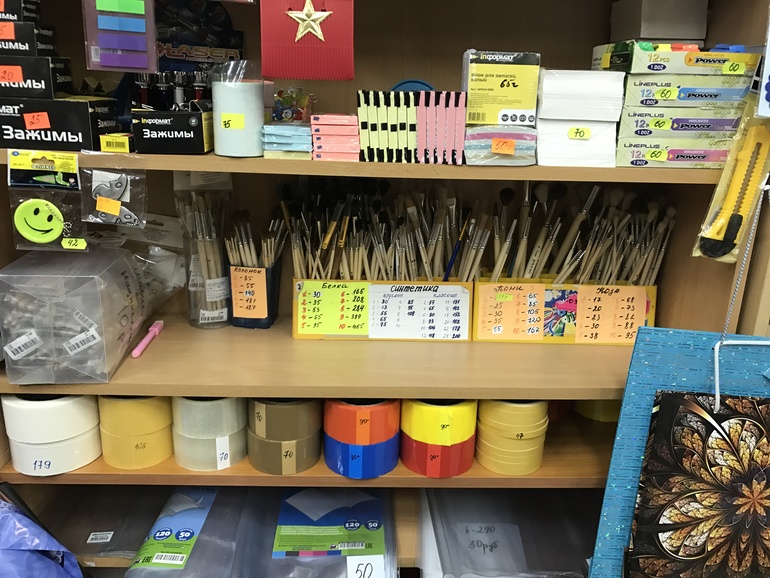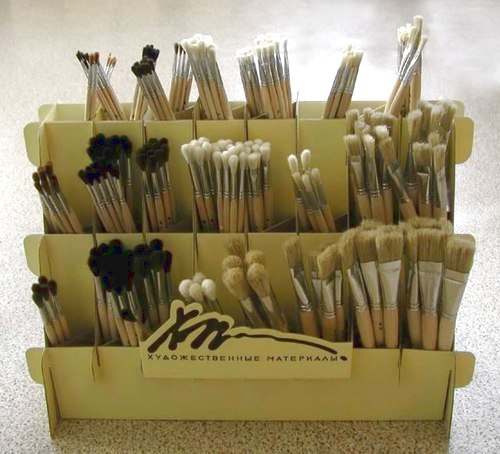 Интерьерные штучки.Добрый вечер! У меня канцелярский магазин, в котором помимо прочего большое количество видов кистей для рисования. Кисти деревянные, тяжёлые, никакой стаканчик не выдержит. Нужен какой-то ящик с ячейками, чтобы поставить в шкаф. Ищу и не могу найти. Или может кому-то в голову идея придёт - как поставить кисти, может для кухни коробки например, или для детской, о которых я не подумала? Пока лежат в коробке под столом, там их не видно((