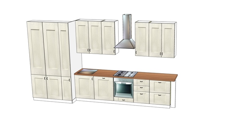 Т.е. никаких скошенных углов, открытых полок, стекла и т.д. Мойку перенесли. Будет нержавейка большая с крылом, т.к. от посудомойки я отказалась в пользу ящиков. Жалко, никуда не получилось придумать колонну - хотела духовой шкаф в колонну. Ну и холодос придется ставить отдельный, а не встроенный. Но это самый лучший вариант с нашим котлом. Всё, как я хотела. Это , конечно, не точная копия моей будущей кухни, просто набросок как примерно всё это будет выглядеть. Ручки будут не такие - внизу будут икеевские небольшие рейлинги, а вверху на дверцах шкафа с котлом - маленькие круглые ручки. Цвет кухни - белый, форма фасадов - такая же. Не будет уголка-плинтуса по периметру столешницы - мне не нравится, но, говорят, что не практично без плинтуса.