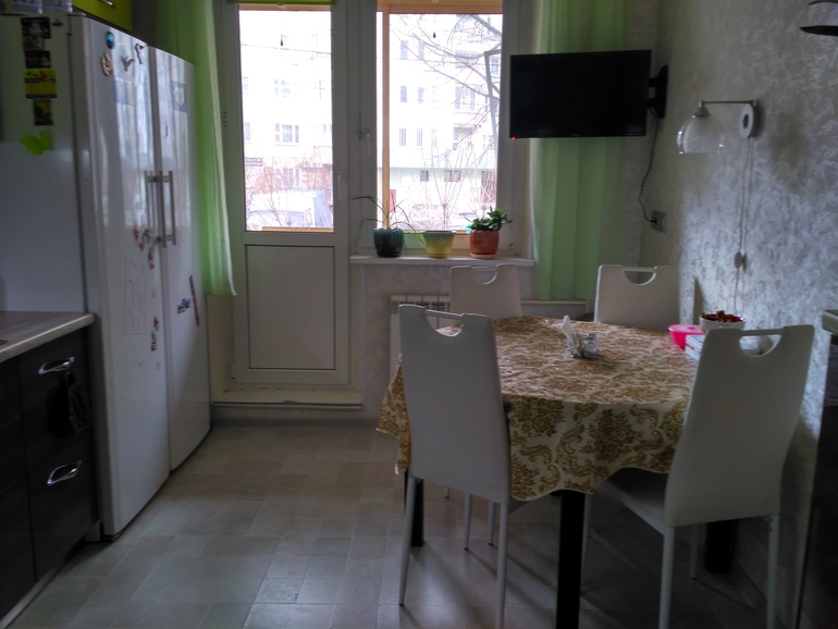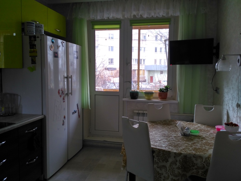 Очень здорово, вот только скатерть на столе я бы заменила и прошу прощения, не поняла - у вас антресоль над дверями? Если да, я бы там дверь поменяла на другую - двустворчатую и типа жалюзи (надеюсь понятно объяснила).