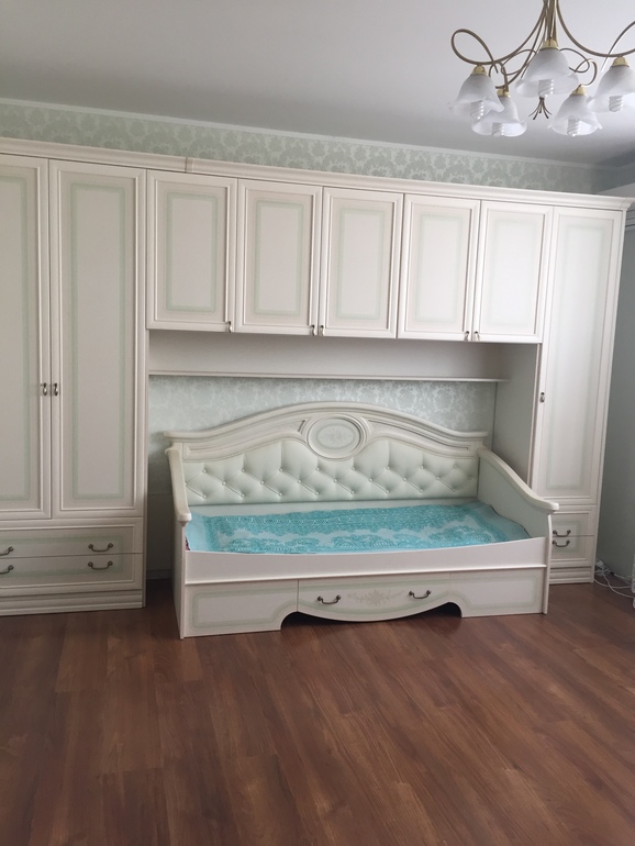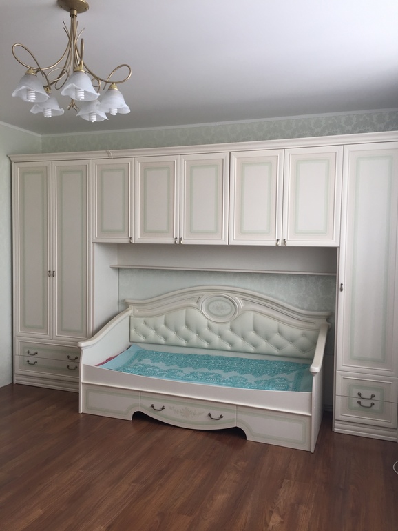 Пол прекрасно сочетается с люстрой и мебельной фурнитурой. Правильно ниже пишут, что карниз просится бронзовый тоже. Очень гармоничная комната получилась!