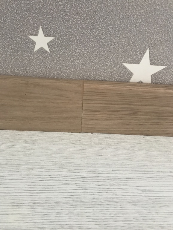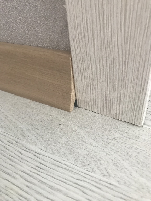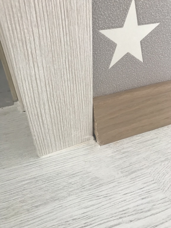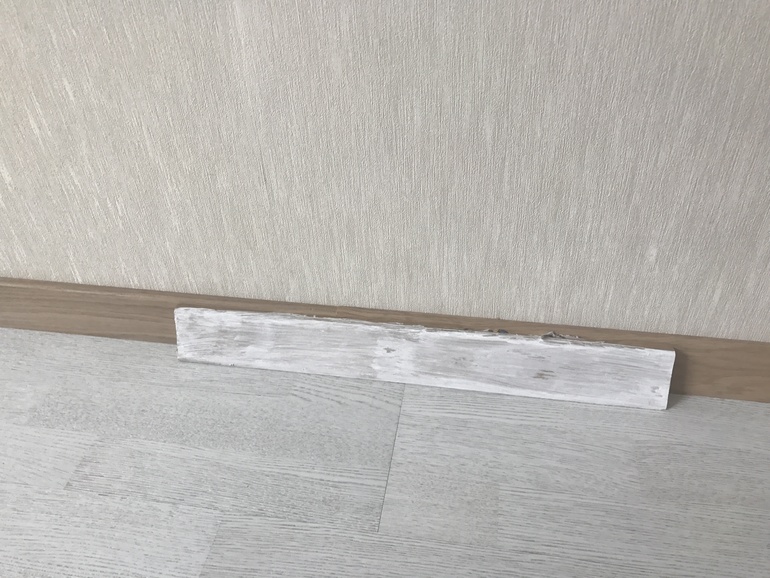 Цвет плинтусов нас почему-то не смутил, когда покупали. Подумали, что не проблема будет его затонировать в подходящий тон после установки. Свёкор установил плинтуса (поклеил на жидкие гвозди, стандартные крепления они с мужем не смогли освоить, то ли стены кривоваты, то ли руки :) ). Вопросы: