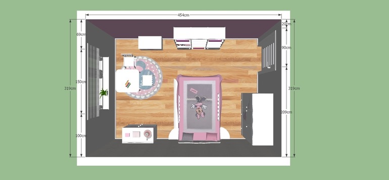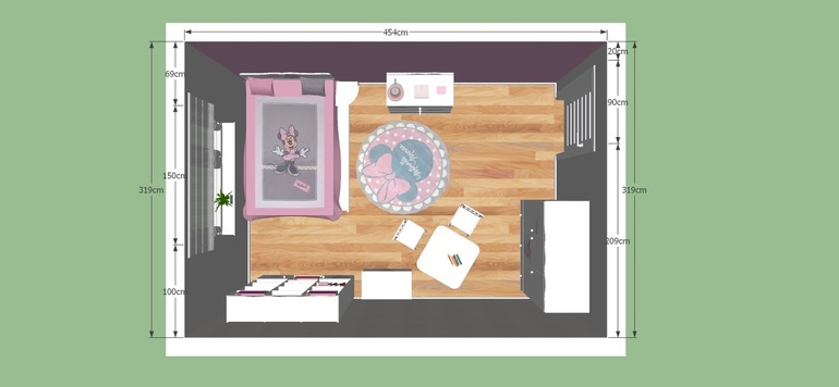 Если ребёнок правша, стол нужен по правой стороне. Исходя из стен кровать тоже по правой стороне. По левой систему для хранения одежды и игрушек. Комната небольшая, не советовала бы клеить обои с рисунком, лучше постер и менять по растущим интересам ребёнка.