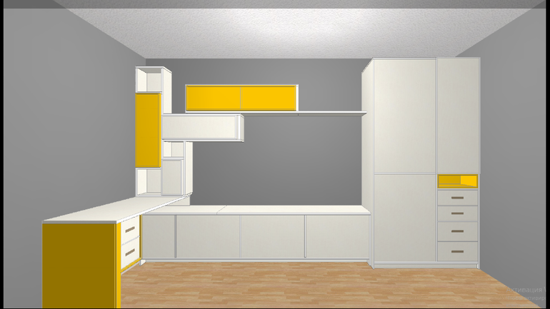 Мария, размещу для вас проекты, которые рисовали мне дизайнеры из Меблик.ру. Размеры комнаты близки к Вашим. Расположение окно - дверь похожи. Оттолкнувшись от имеющегося проекта, Вы сможете дорисовать комнату для мальчика. Я по проекту для младшей дочки "дорисовала" для сынули. У них комнаты расположены зеркально. Здесь два варианта. Если потребуется вышлю всю визуализацию. Могу попросить для Вас у менеджеров из Меблика готовые проекты. Думаю, что не откажут, мы же уже 8! лет шагаем вместе. Тем более, что они их бесплатно готовят для клиентов.