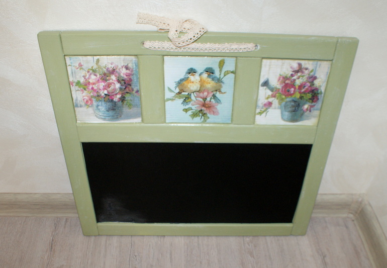 Интерьерные штучки.Всем привет! Покажу какая грифельная доска у меня получилась. Сейчас ремонт кухни идет к завершению, а я тем временем готовлю декор. Вообще я люблю всякие декоративные штуки. Подобную доску я как то увидела на просторах интернета, а потом мне попалась старая доска для маркера, которой ребенок давно не пользовался, я взяла в руки пилу маленькую, краски, лак, грифельную пленку и картинки, вот что получилось: