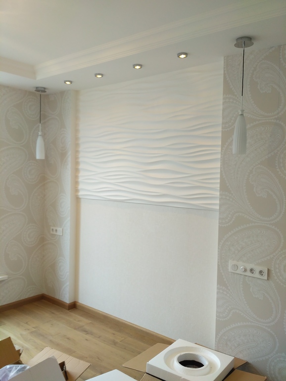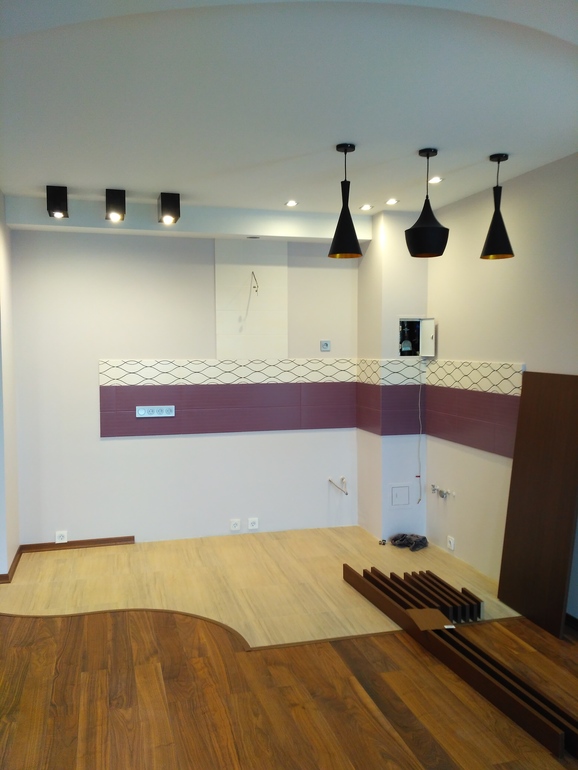 После обмера и обсуждения проекта с заказчиками,мы все таки решили демонтировать одну стену, чтобы избавится от длинного бесполезного коридора и визуально увеличить площадь кухни/гостиной.