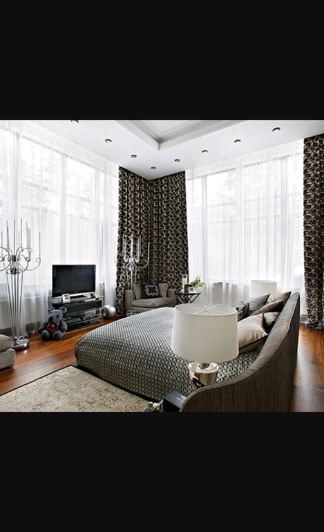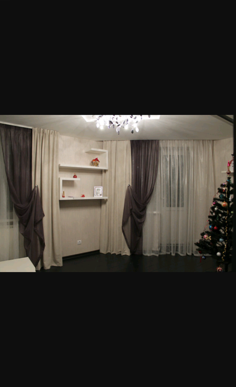 У нас на узкой стене широкое окно, на длинной окно-балконная дверь. И там и там висит тюль. Гардины заказать так и не дошли руки.