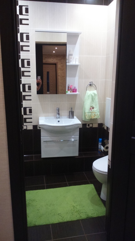 Интерьерное решение ванной комнатыНаш второй санузел, небольшой, в контрастных тонах. Можно было сделать ещё душевую кабину, но в первом санузле ванная, тумба раковина, унитаз, решили, что на семью из 3-х человек одной ванной достаточно). Все просто и бюджетно, но не хватает мест для хранения.