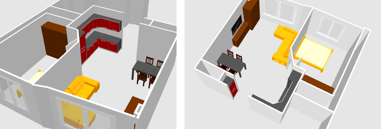 Выделена зона для размещения кухонного гарнитура, а шкафы уже можно расположить в разных вариантах ( с проходом в гостин