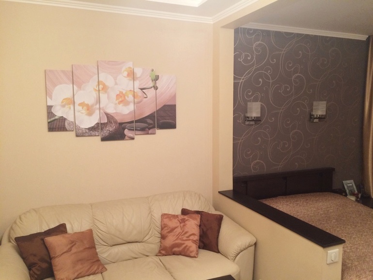 Интерьерные штучки.Девочки,хочу услышать мнение со стороны(извините заранее если не туда пишу). Купили модульную картину,пока на скотч прилепили,подскажите,подходит ли она по стилю и не высоко ли весит?