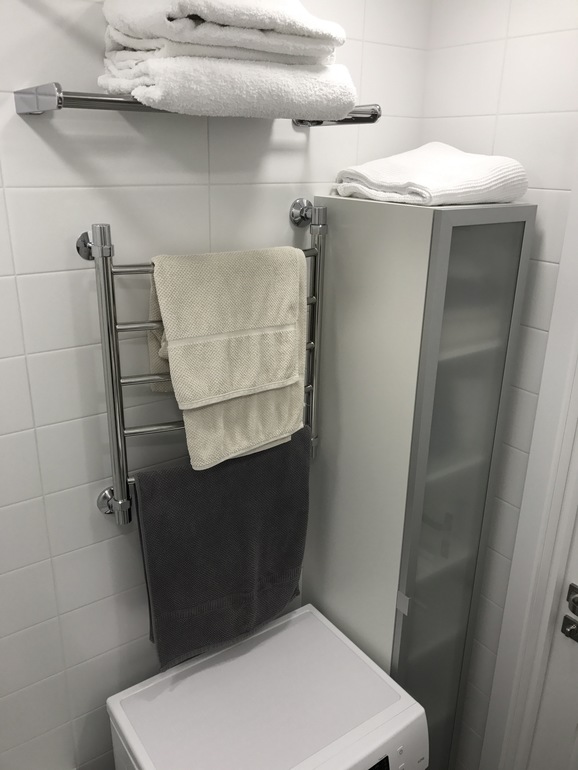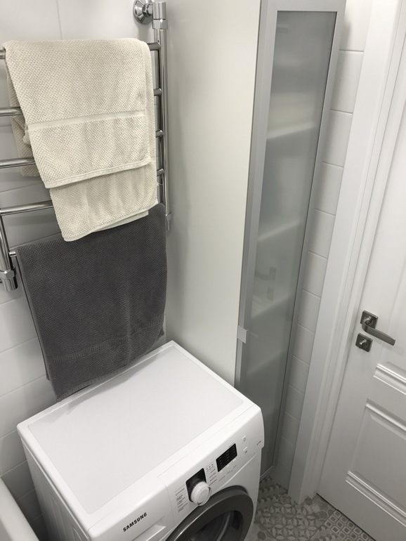 Красиво)) у нас только полотенчик на стене параллельно шкафу..И если делать над машинкой шкаф большой,то не подлезть к нему( полотенчику)..Решили вроде просто пенал..