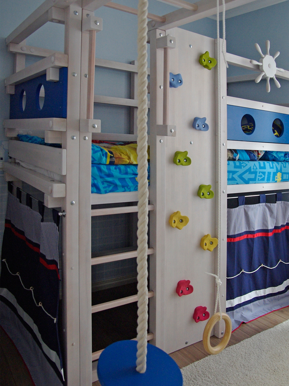 Мы такую на дачу купили. Хорошая кровптка, только мы ее одним боком к стене прибили, на всякий случай. Сын по ней лазает, до самого верха. Вобщем она ему нравится. Но переселиться спать в нее у нас пока не получилось. Сыну 3,5