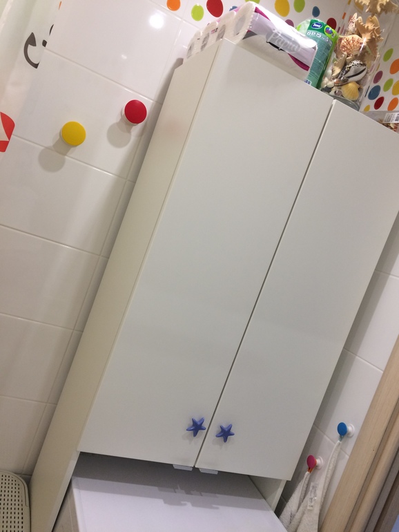 Спасибо! Шкафчик из Икеи для ванной комнаты, полочка тоже из икеи может крепиться на присосках, но мы прикрутили шурупами, шторка и круглые разноцветные крючки -ИКЕА. Ручки-звездочки на шкафу из Зары хоум.