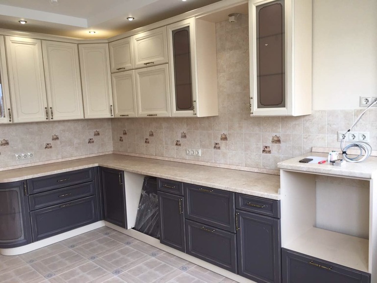 на свой вкус, я бы разбавила бежевый примерно как на этом фото, а подушки на диван, в цвет нижних фасадов.