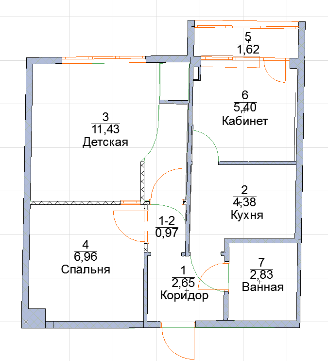 Встала задача выделить на данной площади Детскую, Спальню и даже Кабинет, т.к. один из членов семьи работал дома и очень хотел отдельное место для работы, пусть даже небольшое. При этом было условием: перепланировка должна была быть без сноса стен, что создало существенные ограничения в плане вариаций.