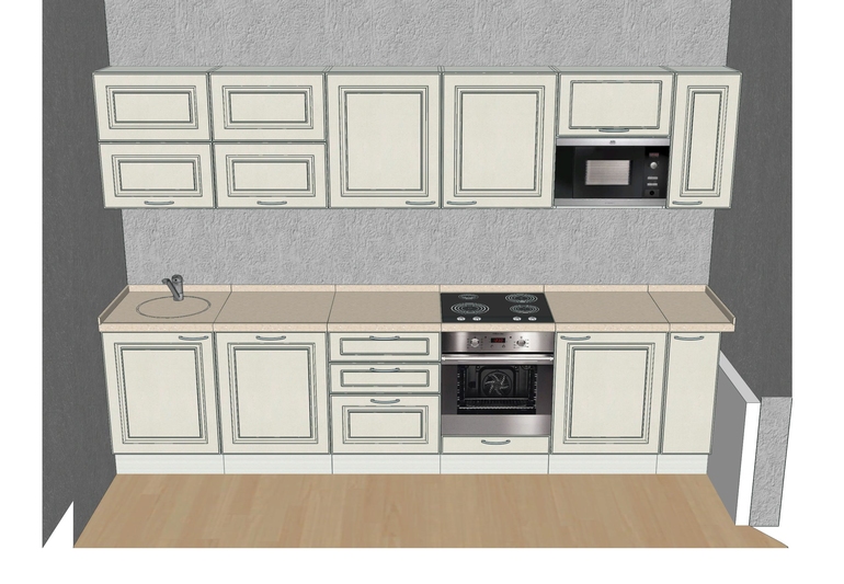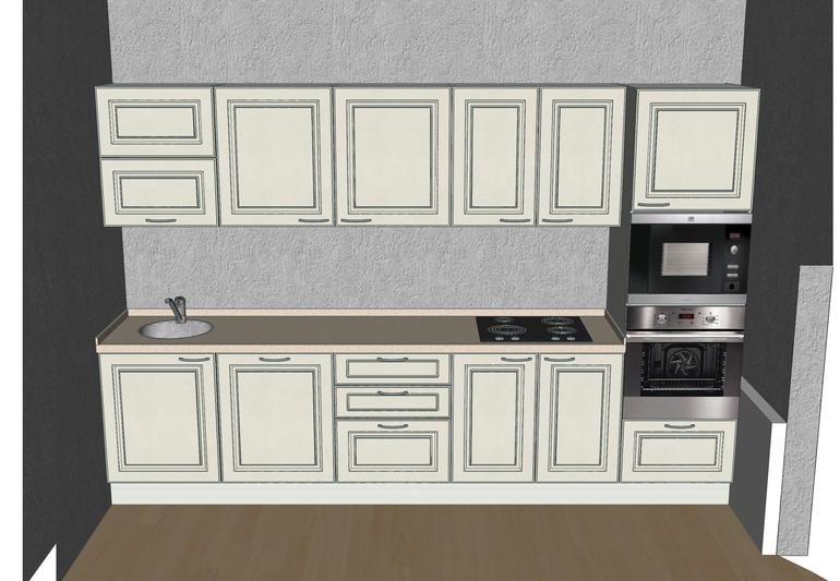 Планирую установку кухни, помещение квадратное 3,20 на 3,30. По стене 3,2 м прямая кухня (угловую не рассматриваю в целях экономии), холодильник на другой стене.Необходимо разместить мойку, посудомоечную машину, варочную, духовку, вытяжку, микроволновку. Очень хочется функциональную кухню: выкатные ящики,аверсы (подъемные механизмы) и чтобы смотрелось красиво, симметрия была. Эти проекты нарисовали в Марии: