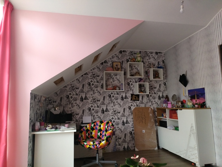 Интерьерное решение детской комнатыПодскажите, какой цвет выбрать для комнаты дочери, она конечно хочет розовый и фиолетовый))) А у меня ступор просто, особенно не знаю как перегородки эти красить, они отделяют учебную зону. В комнате достаточно светло, но солнышко бывает только во второй половине дня. Фото удалось сделать только поздно вечером